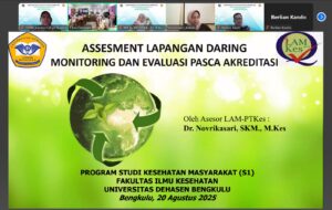 Bengkulu, 20 Agustus 2025 – Program Studi Kesehatan Masyarakat (S1) Fakultas Ilmu Kesehatan Universitas Dehasen Bengkulu melaksanakan Assessment Lapangan Daring (ALD) Monitoring dan Evaluasi Pasca Akreditasi melalui platform Zoom Meeting. Kegiatan ini menghadirkan asesor dari Lembaga Akreditasi Mandiri Pendidikan Tinggi Kesehatan (LAM-PTKes), Dr. Novrikasari, SKM, M.Kes.